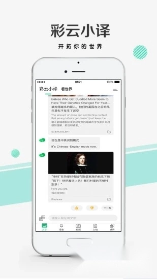我们的新产品是一款名为「彩云小译」的翻译助手,有了它,一家人仅需这一个,就能与外国人顺畅交流。