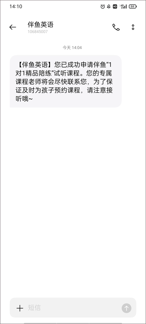 4、稍作等待后,伴鱼少儿英语会发送短信告知你已成功领取,只需添加老师的微信,就能享受相应课程服务。