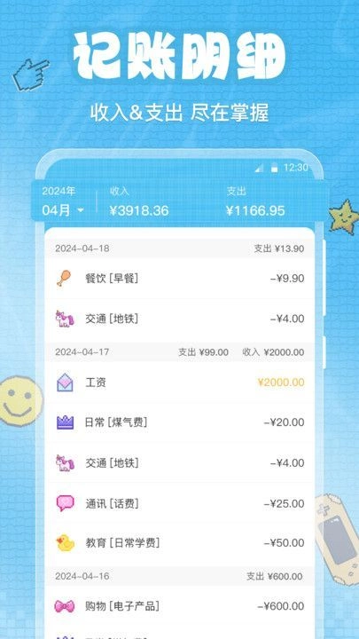 2、用户只需简单点击几下,就能记录每一笔收入与支出,管理过程也更为轻松。