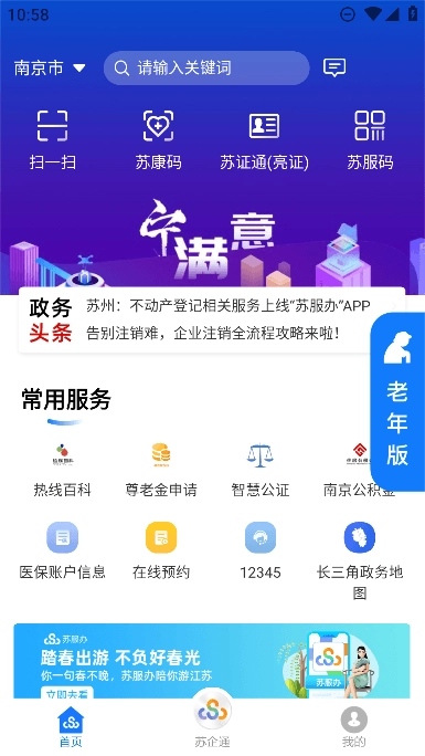 当进入首页时,映入眼帘的是众多功能,其中包括热线百科、尊老金申请、智慧公证、在线预约、医保账户信息、12345等。