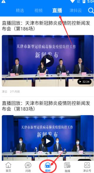 在功能栏中点击“视听”,接着在上方选择“直播”,就能在线观看各场防疫新闻的回放啦!