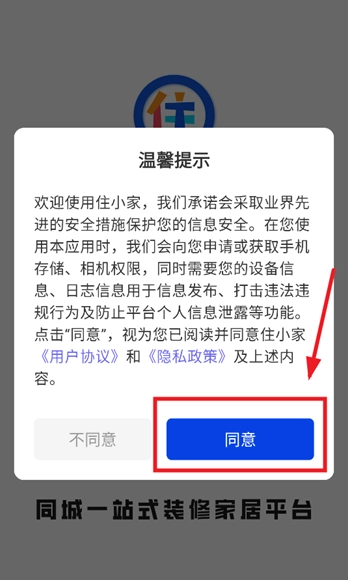 安装并打开住小家,先同意温馨提示;