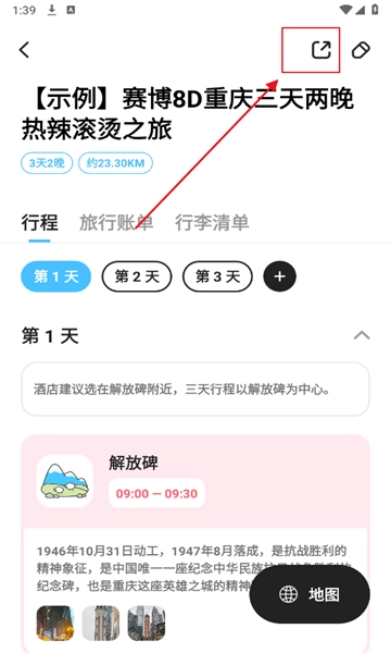 2.在旅行计划页面,点击右上方的分享按钮