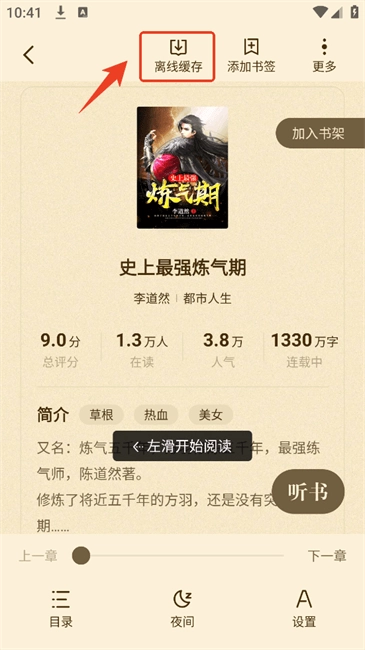 1. 打开拾贝小说,你能够借助分类或者搜索功能,迅速找到自己感兴趣的作品,接着点击进入。在小说的简介页面,点击上方的【离线缓存】。