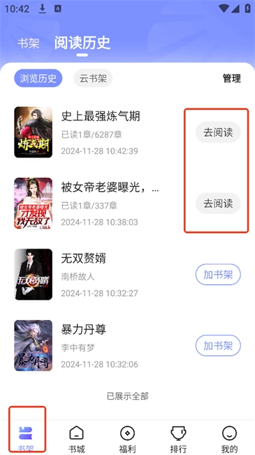 3. 在【书架】板块,能够看到刚才的小说,点击进入阅读,就能实现离线浏览。