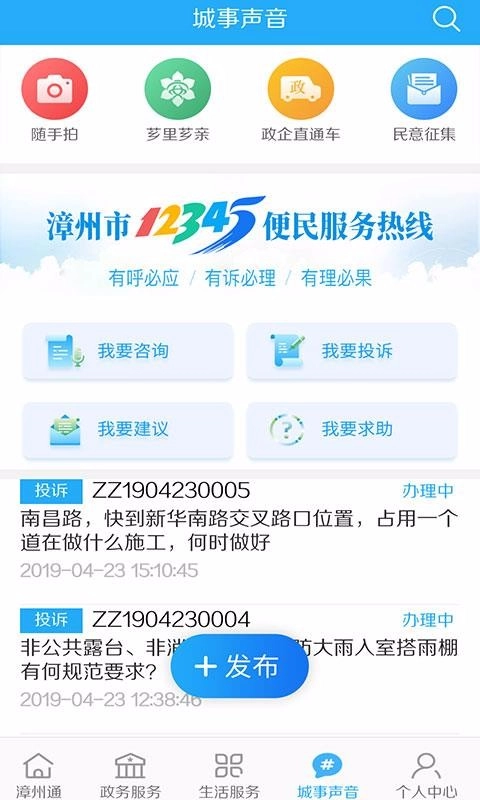 5、城事声音板块,支持发布投诉、求助、咨询、建议等各类信息。