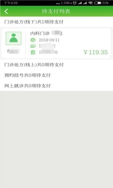 在首页选择“门诊缴费”功能,页面会显示出需缴费的项目。
