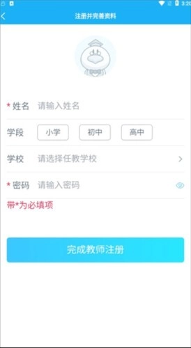 2、然后点击注册,填写各种基本资料,比如姓名,学段,学校等,然后点击完成教师注册。