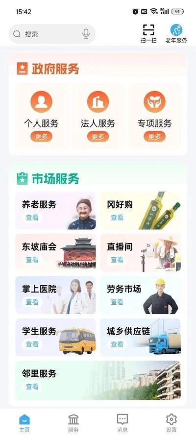 由当地政府主导开发的这款全市性综合服务移动应用,整合了乡村便民、农业生产、务工对接、农产品加工、乡村旅游、产销对接等多元服务功能,同时覆盖教育、养老、住房、就业、交通、旅游等民生热点领域。平台当前主要划分为市场类服务、政务部门服务、特色专项服务三大核心板块。