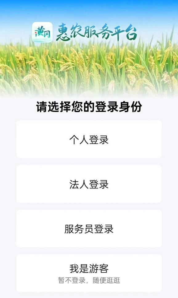 当用户初次进入“i黄冈”平台时,可根据自身实际情况选择合适的身份类型,可供选择的身份选项涵盖了个人用户登录、法人主体登录、服务人员登录以及游客身份访问这几种。