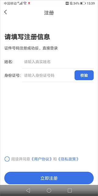 在弹出的新界面中,准确录入个人真实姓名与身份证号码,确认勾选同意相关协议及隐私条款后,点击“立即注册”按钮完成操作。
