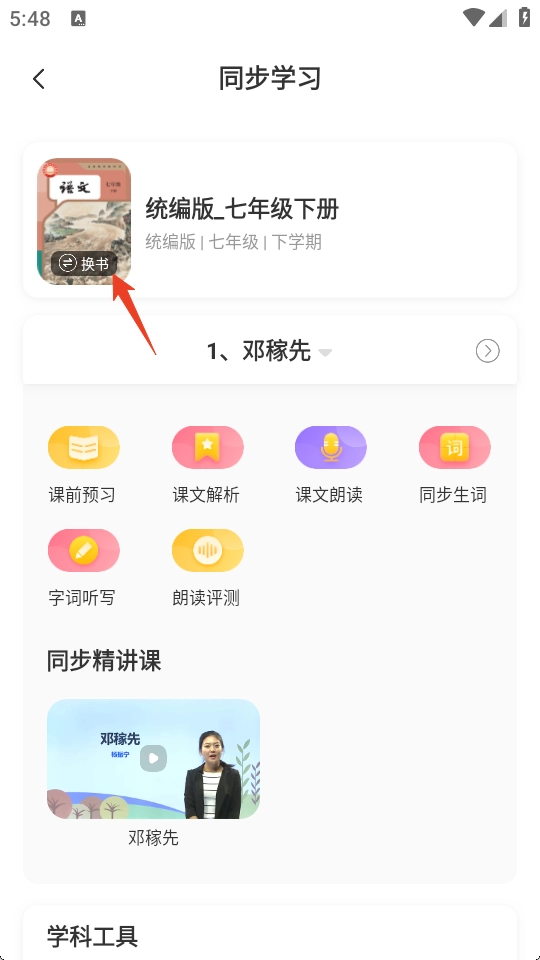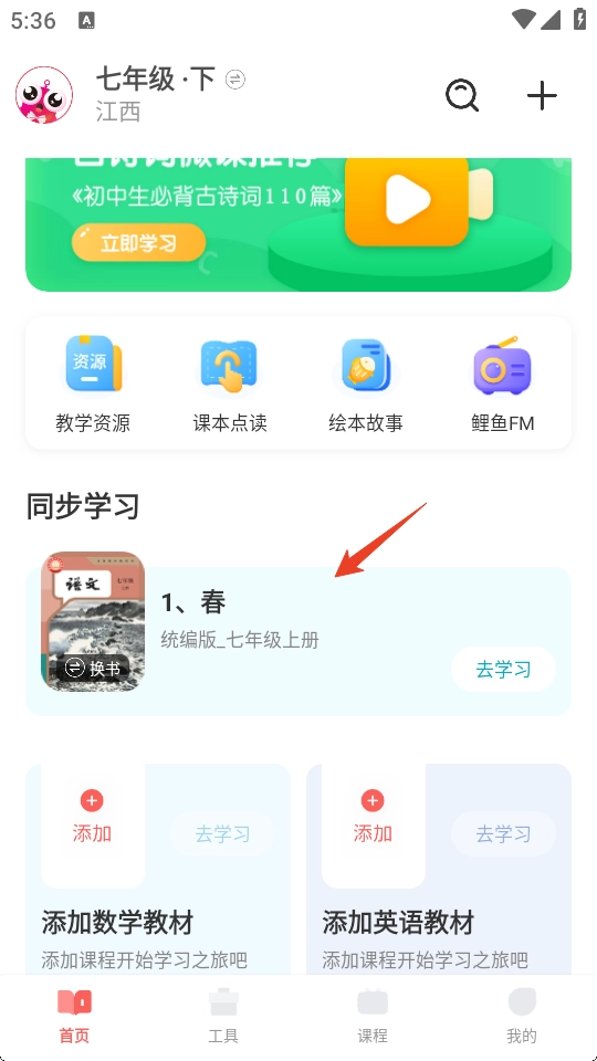 打开鲤鱼辅导,点击同步学习下现在的教材