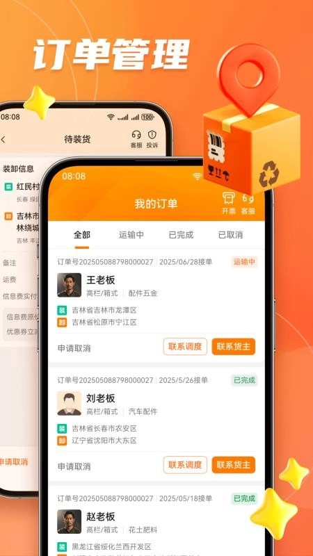 支持用户实时管理自己的订单,查看订单详细信息,以便更好地联系货主。