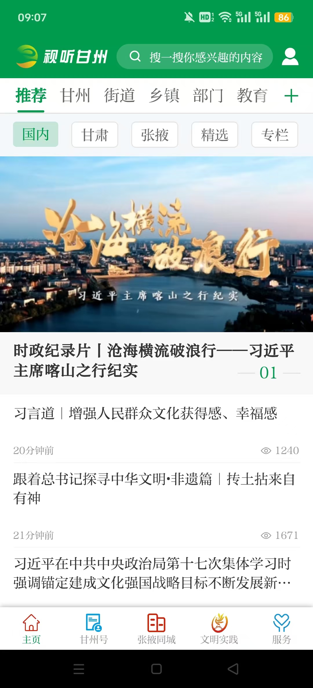 在“主页”板块,设置了头条、国内、甘肃、张掖、时政社会等栏目,整合了区域内部门、街道(社区)、镇(村)等政务服务资源,用户通过客户端就能第一时间掌握甘州区在政治、经济、教育、文旅、农业、民生、服务等领域的最新动态。此外,主页还设有微影甘州、图说甘州、八声甘州、媒体看甘州、直播甘州、广播电视等特色栏目,助力用户全方位了解甘州。