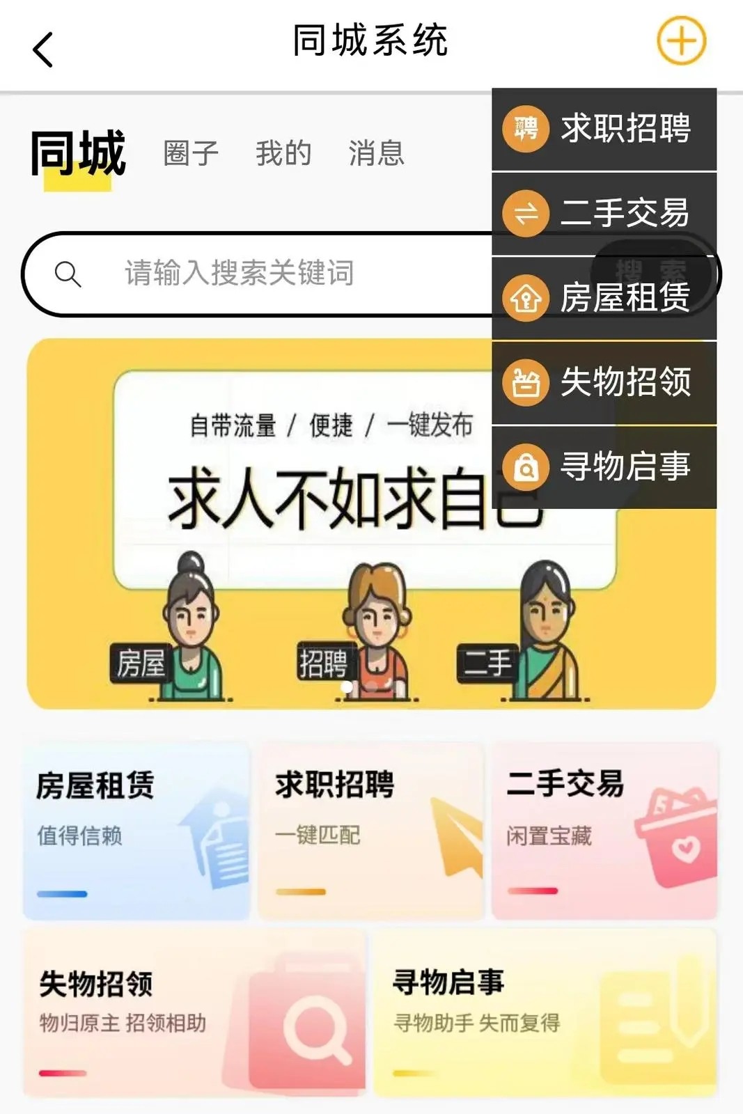 涵盖同城招聘、二手交易、房屋租赁、失物招领、寻物启事等多元服务场景,为居民群众提供便捷服务;支持一键发布信息,助力企业实现高质量发展。