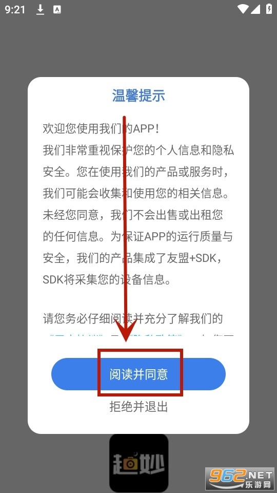先安装趣妙相机,安装完成后打开它,接着点击“同意并继续”按钮,同时确认同意其隐私政策。