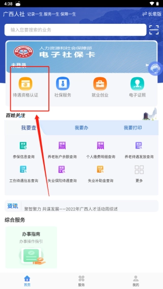 打开广西人社养老认证应用,点击界面底部的【资格认证】选项。