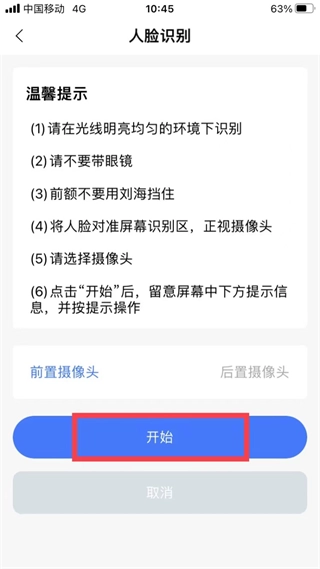 核对信息无误后点击“开始认证”,请仔细阅读温馨提示,然后选择“前置摄像头”或“后置摄像头”,最后点击“开始”按钮即可。
