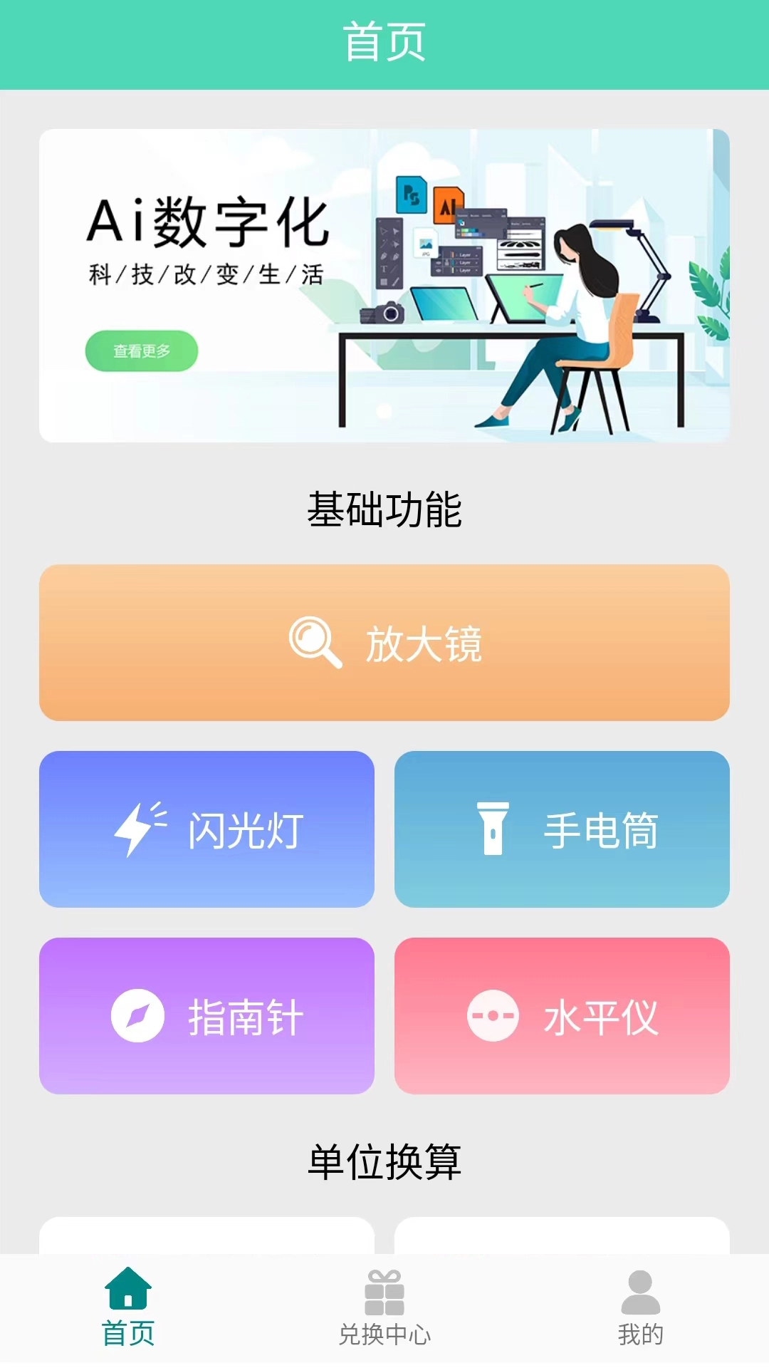 放大镜功能可帮助用户在查看细小文字或物体时获得清晰的放大效果。指南针功能能为用户提供准确的方向指引,适合户外活动或旅行时使用。水平仪功能让用户在摆放物品时能确保水平,避免因不平带来的困扰。单位换算功能覆盖长度、面积、体积和重量等多种单位,可轻松实现各类单位间的转换,极大地方便了日常生活中的计算需求。