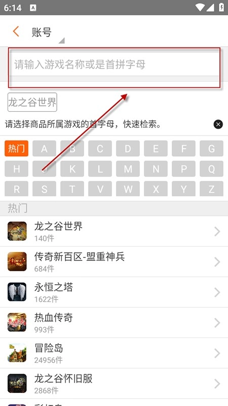 输入游戏名称或首字母,或按热门首字母筛选游戏。