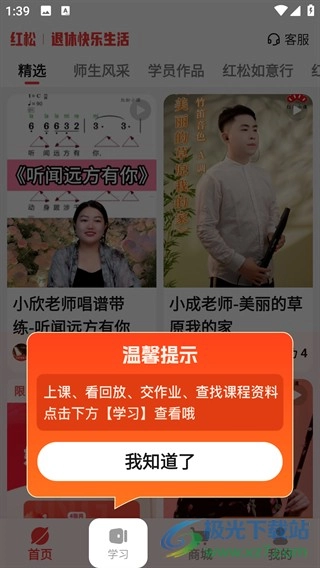 红松是一款面向中老年人打造的在线学习应用。它依据老年群体的学习偏好,涵盖了声乐、乐器、朗诵、书法、绘画、舞蹈、中医养生等丰富多样的学习板块,能够适配不同用户的线上学习需要。