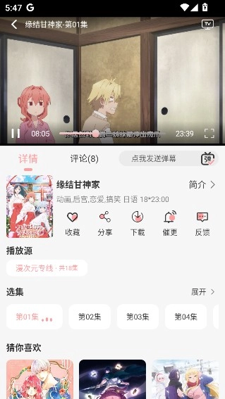 用户点开自己喜欢的动漫后,能够挑选集数、选择播放源,还可以发送弹幕等。