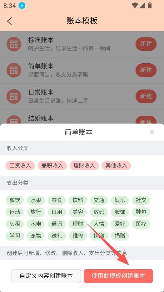 点击“使用此模板创建账本”,就能借助该模板来记录收支情况。
