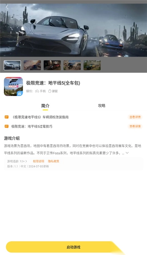 进入游戏界面可以看到简介、攻略以及启动键;