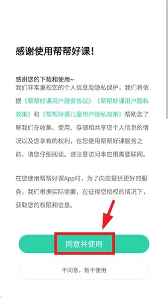 先安装帮帮好课应用,打开它之后,等进入到显示“感谢使用帮帮好课”的提示界面,就点击“同意并继续”按钮。