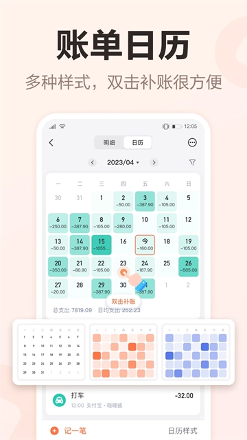 日历账单:4种账单日历,每日收支一目了然,漏记补账方便快捷。
