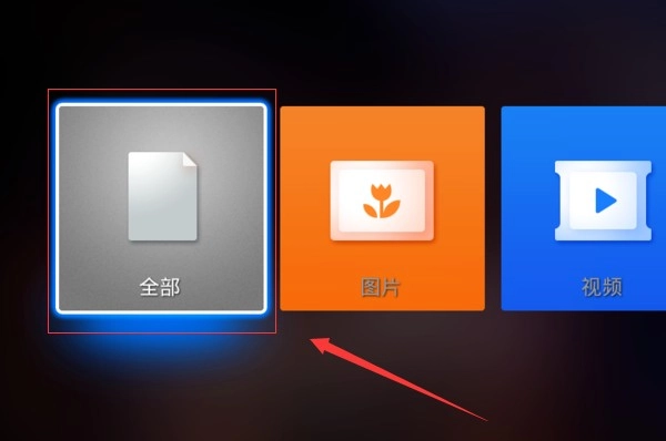 将U盘插入电视的接口后,系统会自动识别到外接设备并弹出对话框,此时选择“全部”选项即可进入文件管理界面。