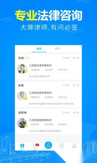 您身边的法律帮手,查找附近律师,提供免费法律咨询服务,覆盖离婚争议、劳动仲裁、交通事故、遗产继承、债权债务、侵权索赔、房产争议、知识产权等多个领域,精准匹配专业律师为您服务;知名律师协助处理律师函、代写法律文书、合同审核、担任法律顾问、代理诉讼,满足您的深层法律需求。