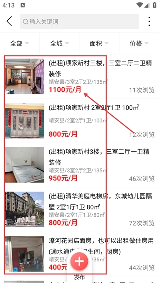 在房屋出租列表页面,能够借助全部、全城、面积、价格等筛选条件来缩小搜索范围,挑选出目标房源后,点击即可进入该房源的详情页。
