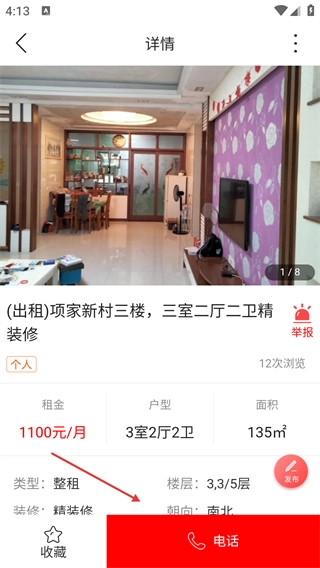 在房源详情页面,浏览完租金、户型、面积等信息后,点击【电话】按钮,就能直接联系出租方洽谈租房相关事宜。
