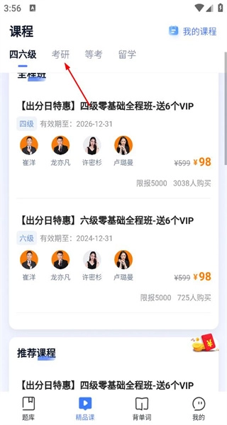 进入课程分类页面,找到四六级、考研等相关标签,点击考研标签即可切换至对应的课程列表。