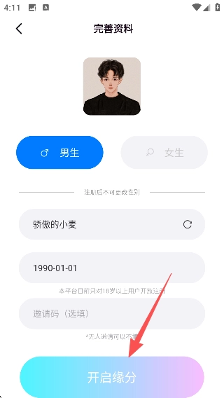 在【完善资料】页面填写性别、昵称、生日等信息后,点击【开启缘分】按钮,就能进入平台主界面。