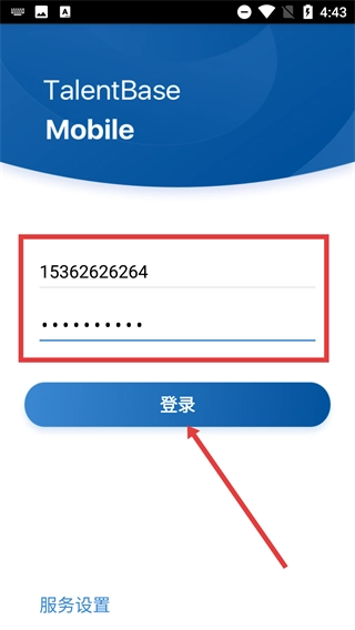 进入【TalentBase-Mobile】登录界面,填写已注册的【手机号】和【密码】,确认信息无误后点击【登录】按钮。