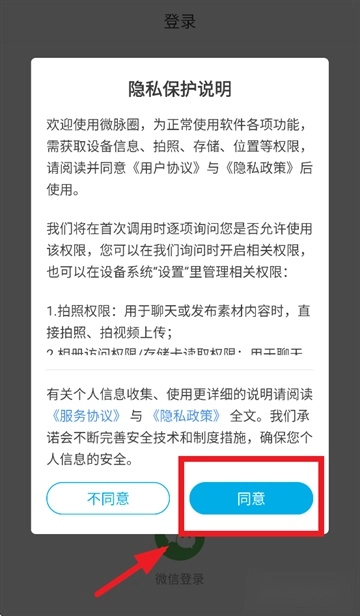 在本站安装并打开微脉圈,先同意隐私保护说明