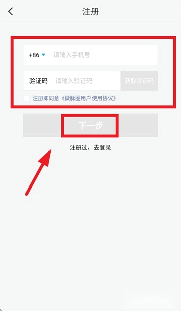 请输入手机号与验证码,勾选“注册即同意《微脉圈用户使用协议》”后,点击“下一步”按钮即可完成该步骤操作。