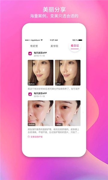 在【美丽分享】板块,你可以查看其他用户的变美实例(包括前后对比),从中找到适合自己的美容护理方法作为参考。