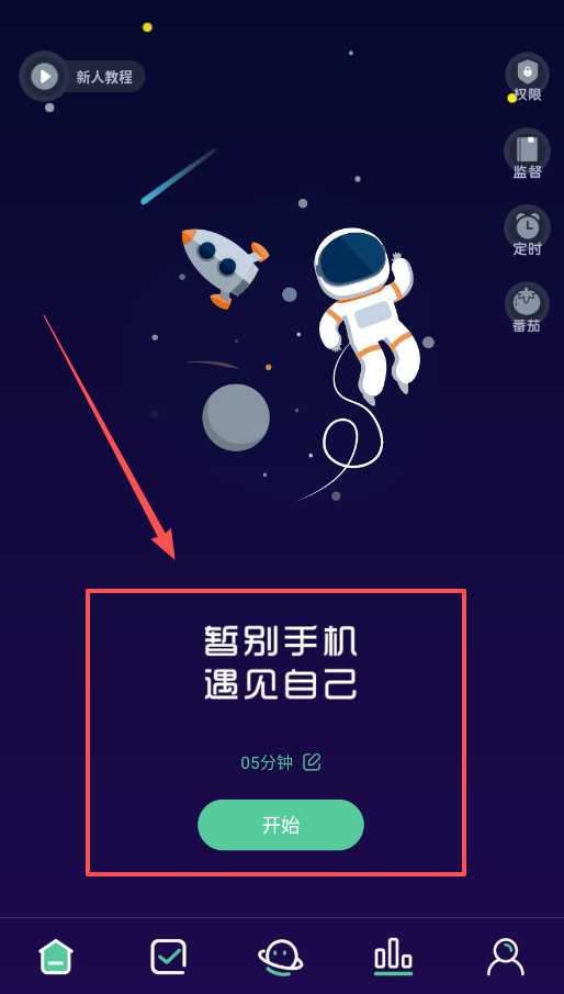 可以通过“新人教程”开启初次体验,先设定一个短时间的目标,比如5分钟,接着点击“开始”按钮。