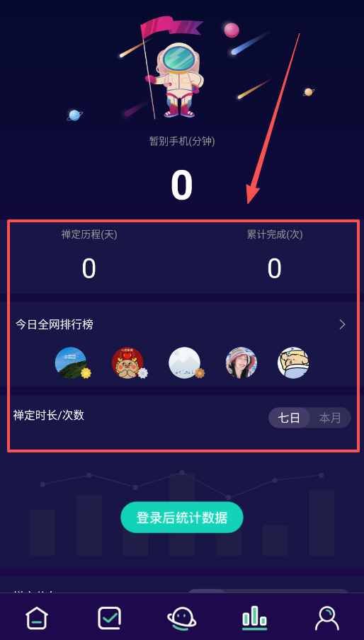 打开应用并完成登录,这样就能启用数据记录和排名功能啦,你的专属数据可以在“我的星球”页面进行查看。