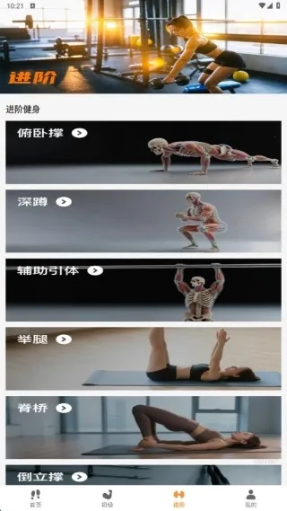 3、进阶页面里展示的是俯卧撑、深蹲这类难度系数较高的运动方式。