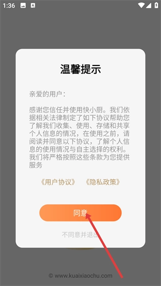 1、在快小厨的【温馨提示】弹窗里,点击【同意】按钮,以此接受《用户协议》与《隐私政策》,进而继续使用相关服务。