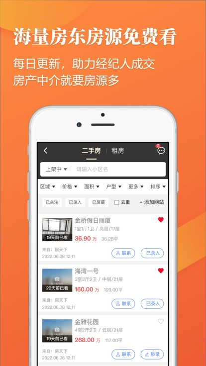 全房源系统为全国房产经纪人提供海量房东委托房源,可自动筛选掉重复、虚假的房源信息,具备高效实时的特点,支持免费查看,还能一键录入系统。