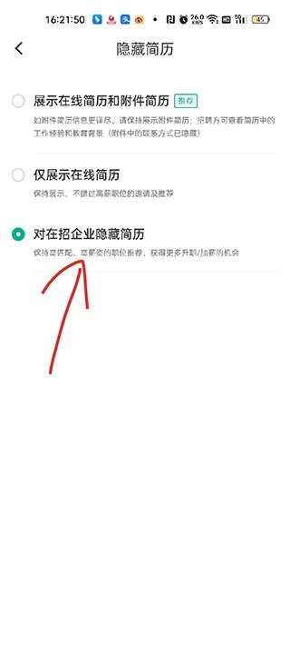 2、进入设置页面后向下滑动屏幕,找到“隐藏简历”相关选项,点击进入该选项页面。
