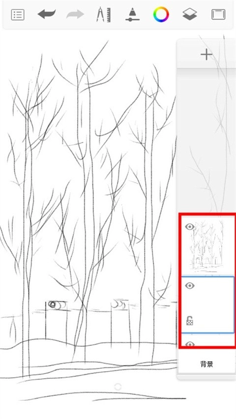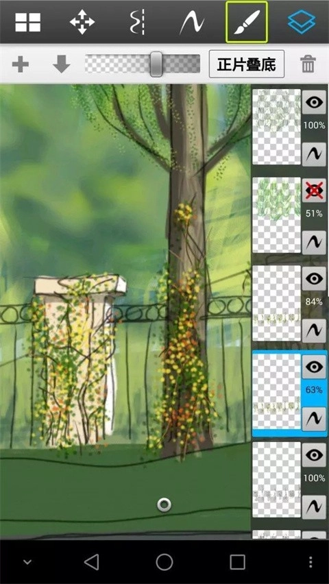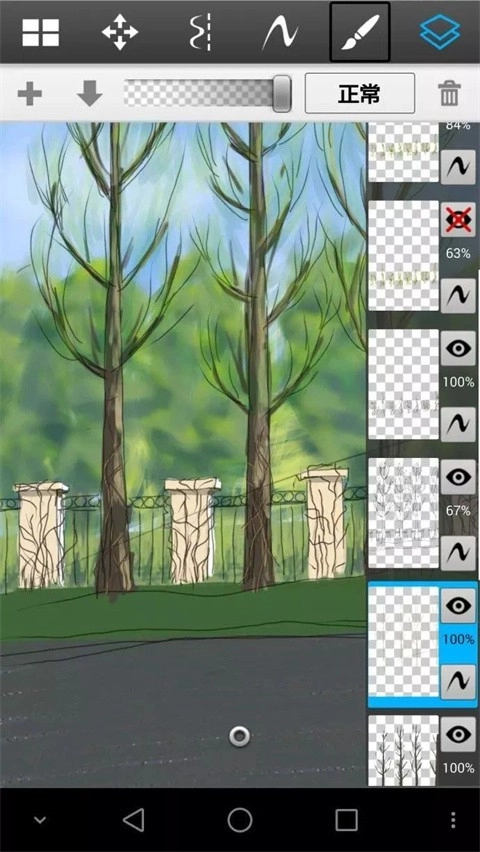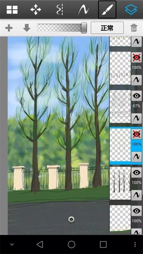 尽量按类别多划分图层,但这款软件的手机版最多只有16个图层。我刚才用喷笔把远树重新处理得更模糊了些,近树的树叶也调整成了透明效果。接下来给大家介绍另一种笔刷,用来添加细节。