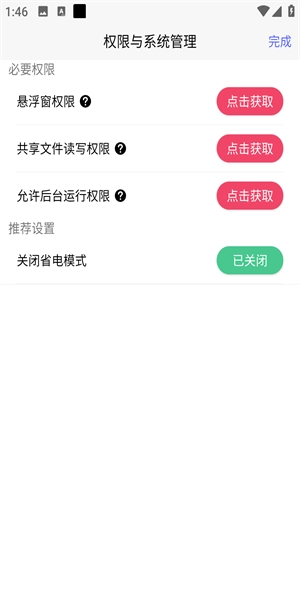 3、回到桌面后点击“开启权限”按钮,接着依据界面上的提示步骤,依次把所有需要的权限都开启。