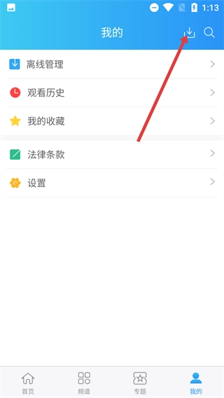 1、进入“我的”页面后,点击右上角的图标,即可进入【离线管理】功能页面,此页面能够对离线缓存的内容进行管理。