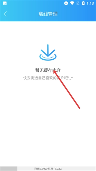 进入【离线管理】页面后,若当前显示“暂无缓存内容”,可前往首页等板块挑选影片进行缓存。